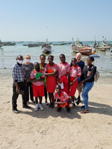 Above: Class of 2021/22 Grade 6 on Tanji Beach visiting the fish market and smoke house. On the right is some salt dried butterfish made by the children